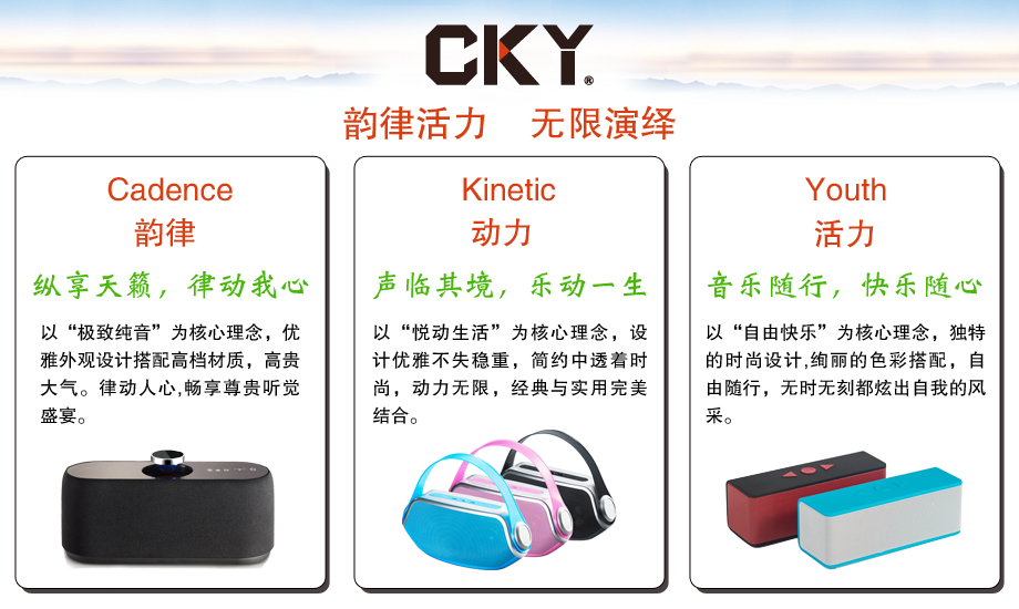早在十年前,CKY团队就专注于蓝牙音箱的研发和生产,经过十几年的积淀,已经创建起了产品成熟稳定的CKY品牌无线蓝牙音箱,翻开了音频产品研发生产崭新的一页。CKY蓝牙音箱目前使用CSR2.1+EDR、CRS4.0、蓝牙V3.0等蓝牙版本,以适应不同的产品和客户需求。